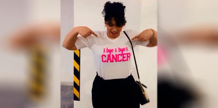 Con un boomerang, la artista señala el t-shirt que viste, donde se puede leer Bye, bye cáncer.