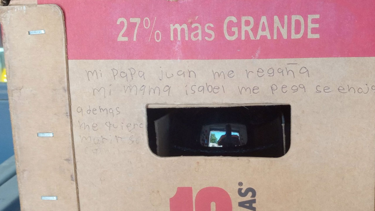 «Mi papá Juan me regaña, mi mamá Isabel me pega, se enoja, además me quiero morir. Soy Camila», se lee en una fotografía publicada en Facebook por Astrid Martínez Ayala, la persona que encontró la caja de cartón donde estaba escrito el grito de socorro.