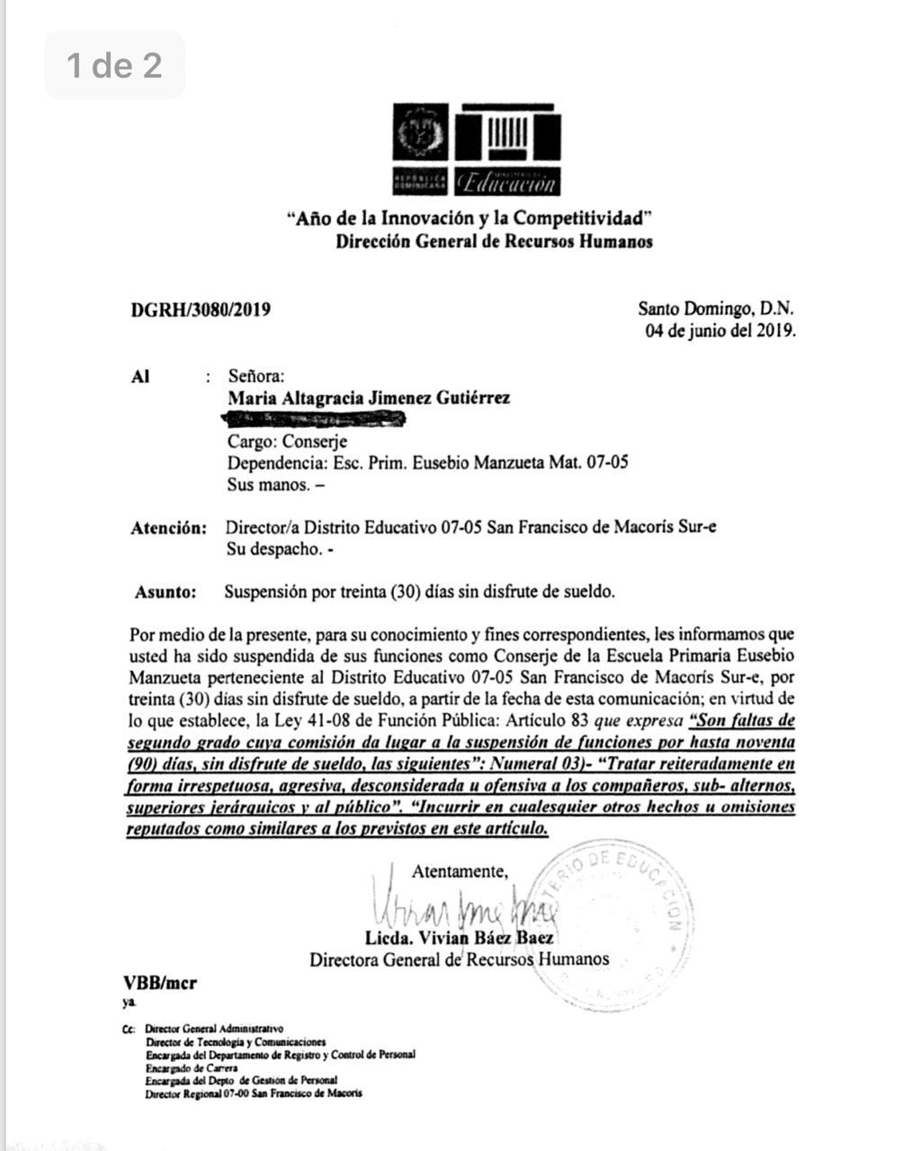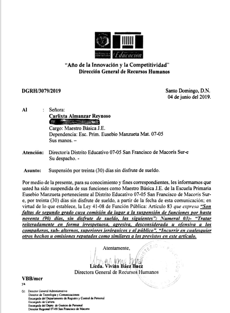 La suspensión de la maestra Carlixta Almanzar Reynoso y la trabajadora de limpieza Maria Altagracia Jimenez Gutierrez es por un espacio de 30 días sin disfrute de sueldo.