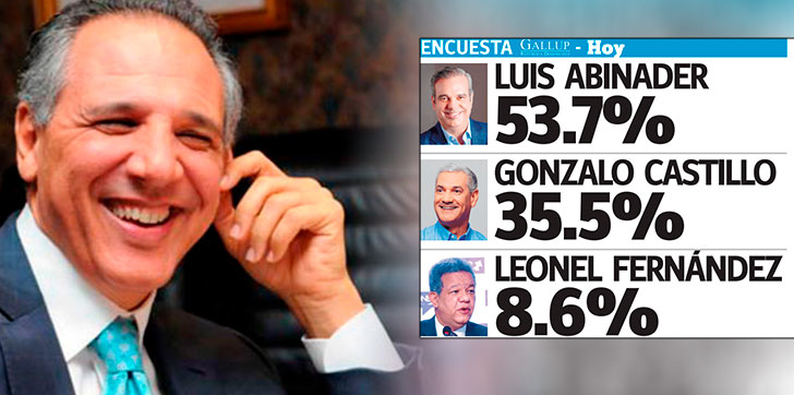 La encuesta, publicada por el periódico Hoy, sitúa a Abinader, del Partido Revolucionario Moderno (PRM), como ganador en primera vuelta, con un 53.7 % de los votos; seguido del candidato oficialista Gonzalo Castillo, del Partido de la Liberación Dominicana (PLD), que recibiría un 35.5 % de los sufragios.