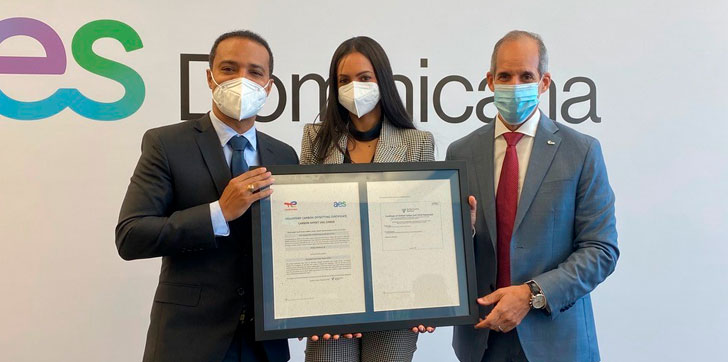 En nombre de CMI, Molinos Modernos, recibieron el certificado José Ezequiel Díaz, Gerente de Proyectos y CapEx y Ana Mercedes Pichardo, coordinadora de sistemas de gestión, de manos de Edwin De los Santos, CEO de AES Dominicana.