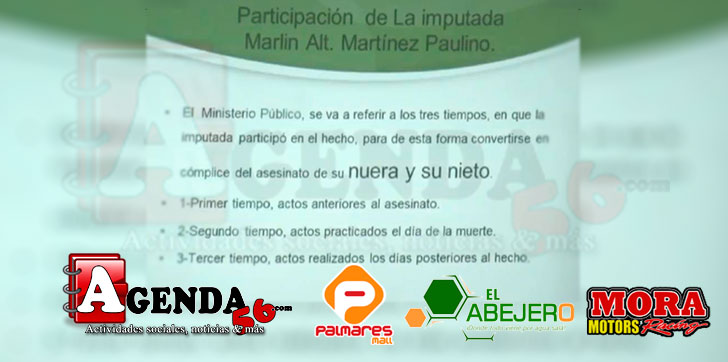 En cuanto Marlin, la acusan en calidad de cómplice en el “asesinato de su nuera y su nieto”, por los actos practicados antes del hecho, confirmados por Bolívar Ureña (El Boli), quien escuchó una discusión con Marlon en la que su madre le dijo ” si fuiste hombre para preñarla se hombre para resolver tu problema y resuelvelo rápido”. Asi mismo el MP afirmó que de manera posterior al hecho, la imputada Marlin participó en el ocultamiento de cadáver.