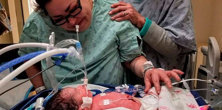 La mujer que viste una bata de hospital acaricia una de las piernas del pequeño. Otra fémina, cuya identidad se desconoce, la aguanta por el brazo.