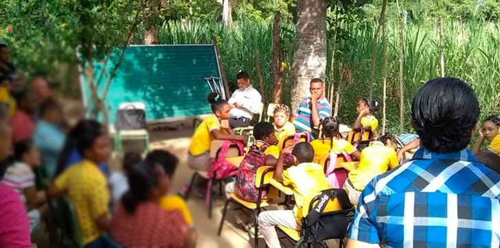 Niños reciben clases debajo de arboles en comunidad de Santiago