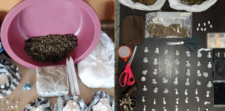 En una habitación fueron ocupadas 31 porciones de marihuana con un peso de 61.1 gramos y 19 porciones de cocaína con un peso de 39.3 gramos, así como 8,695 pesos, un teléfono móvil marca Samsung y una arma de fuego tipo revolver.