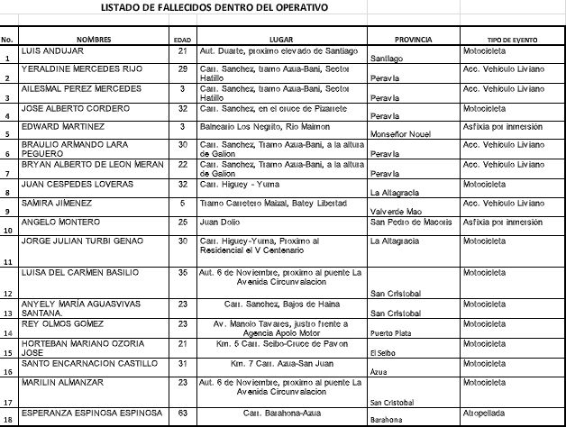 Explicó que del total de personas fallecidas dentro el operativo, 16 personas murieron en accidentes de tránsito y dos por asfixia por inmersión.