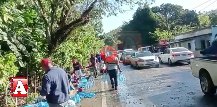 DUARTE.- Un camión cargado de agua y refresco colapsó este jueves, en la llamada curva de la muerte de la comunidad Jobobán, en el municipio Villa Riva.