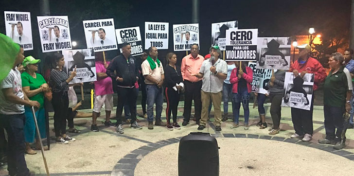 SANTO DOMINGO.- El padre Rogelio Cruz encabeza la noche de éste martes una actividad protesta en la esplanada principal de la Plaza Duarte en demanda de que se le aplique la justicia al sacerdote Fray Miguel Florezán Ulloa.
