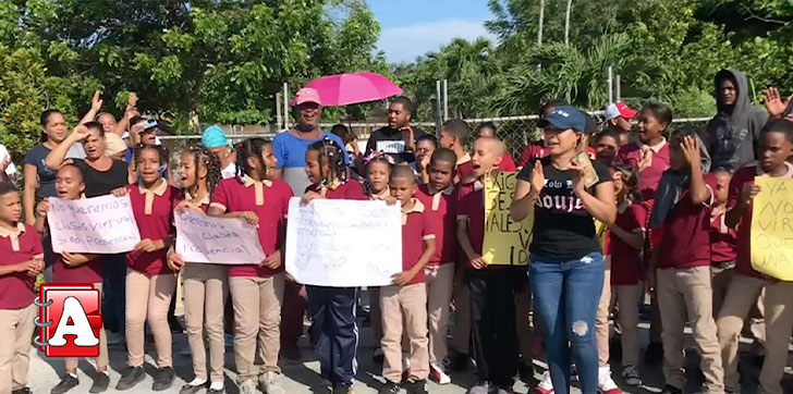 SAN FRANCISCO DE MACORÍS.- Los estudiantes acompañados de sus padres en la escuela Pedro Mir de la comunidad Colón, exigen a las autoridades retornar a las clases presenciales.