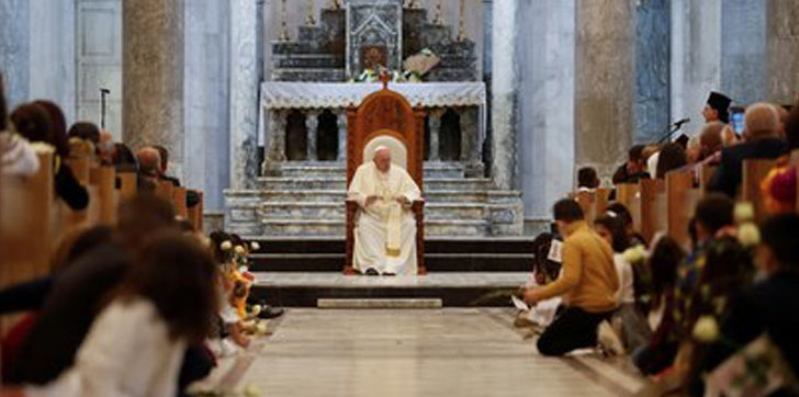 Cantos y niños con flores en las manos acompañaron la llegada de Francisco a esta imponente catedral, que fue quemada y completamente destruida por el EI y cuya reconstrucción concluyó hace pocos meses.