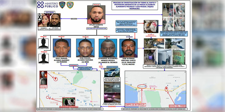 Las autoridades tienen un mapa que muestra el día que la yipeta rentada acudió a la residencia de las víctimas, el momento cuando cruzó el peaje, el día que el principal sospechoso compró los materiales en un supermercado de Boca Chica y el hotel donde ocurrió el suceso, cuya habitación fue limpiada y pintada a fin de borrar las evidencias.