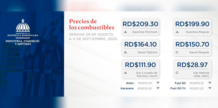 El comportamiento de la demanda de los destilados en los mercados internacionales se refleja en los precios locales de los combustibles. Para la semana del 29 de agosto al 4 de septiembre el MICM dispone que los combustibles se comercialicen a los siguientes precios: