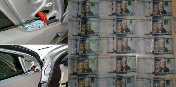 Inoel Nieves Peña confesó a las autoridades que escondió parte del dinero sustraído detrás del plástico interior del retrovisor de la puerta del conductor, encontrando allí la suma de treinta y ocho mil Pesos Dominicanos (RD$38,000.00).