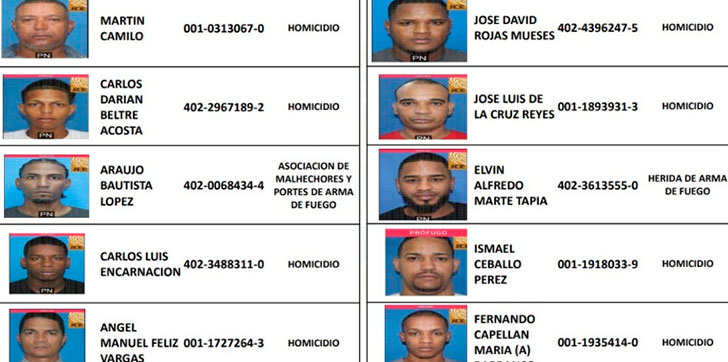 Entre los diez más buscados por homicidios, encabeza el listado Martín Camilo, siguiéndole Carlos Darian Beltré Acosta, Araujo Batista López, Carlos Luis Encarnación, Ángel Manuel Feliz Vargas, José David Rojas Muese, José Luis de la Cruz Reyes, Elvin Alfredo Marte Tapia, Ismael Ceballo Pérez y Fernando Capellán Maria (a) Barranco.