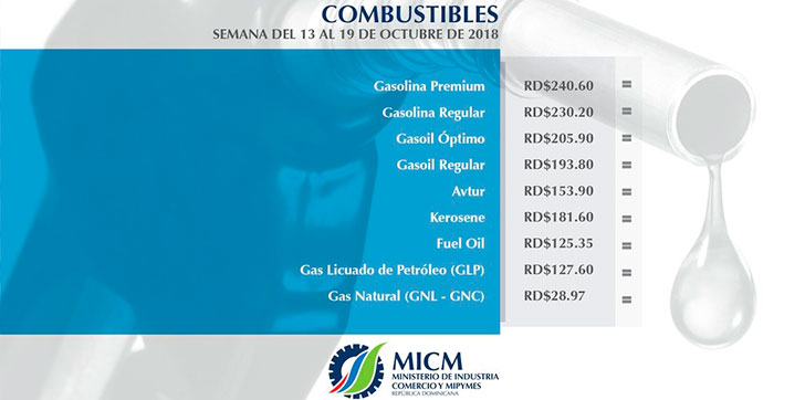 SANTO DOMINGO.- Los precios de todos los combustibles se mantendrán sin variación para la semana del 13 de octubre al 19 de octubre, según informó hoy el Ministerio de Industria, Comercio y Mipymes.