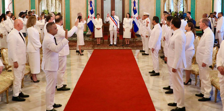 El Jefe de Estado, acompañado de la primera dama Raquel Arbaje y de la vicepresidenta Raquel Peña, tomó el juramento de los funcionarios, en un acto realizado en el Salón de Embajadores del Palacio Nacional, luego de ser investido con la banda presidencial en el Teatro Nacional Eduardo Brito que fungió como Asamblea Nacional.