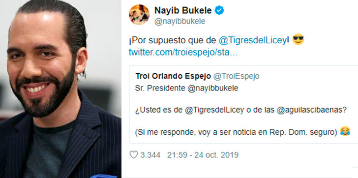 SANTO DOMINGO.- El presidente más joven de El Salvador, Nayib Bukele se declaró fanático de Los Tigres del Licey, luego de que un periodista le preguntara de qué equipo es; si de Los Tigres del Licey o de la Águilas Cibaenas; a lo que él respondió que a los Tigres.
