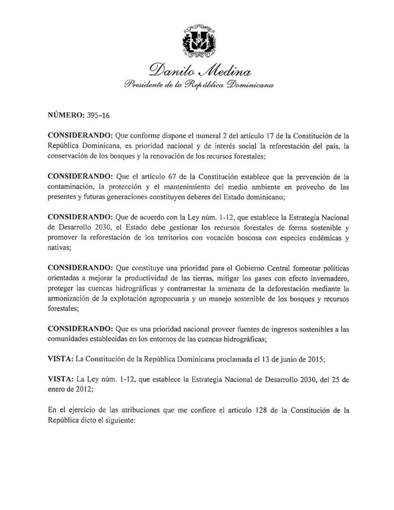El primer Considerando del decreto explica que conforme dispone el numeral 2 del artículo 17 de la Constitución de la República Dominicana, es prioridad nacional y de interés social la reforestación del país, la conservación de los bosques y la renovación de los recursos forestales.