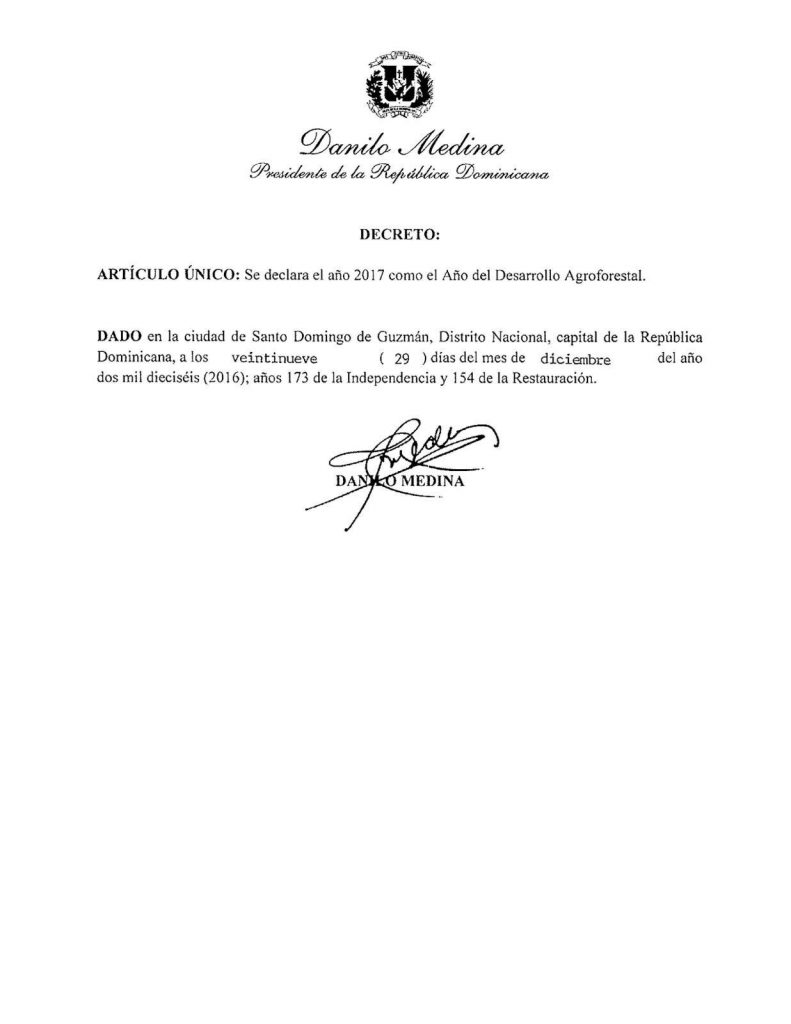 El presidente Danilo Medina, mediante el Decreto 395-16 declaró el 2017 como el Año del Desarrollo Agroforestal.