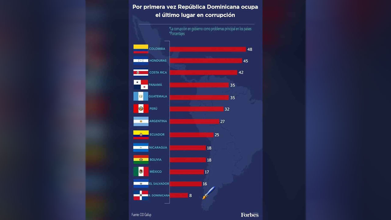 AGENDA56, SANTO DOMINGO.- De acuerdo a los datos más recientes de una encuesta realizada por la Consultoría Interdisciplinaria en Desarrollo (CID Gallup), la República Dominicana se encuentra en la posición  número 13 en el listado de países Latinoamericanos con la corrupción como problema principal.