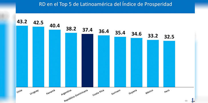 En el más reciente Índice de Prosperidad, que analiza el desarrollo integral de 186 países a partir de factores económicos y sociales, República Dominicana ha logrado un lugar destacado en la región: la posición número 5 entre 23 países de América Latina y el Caribe, con una puntuación de 37.4 sobre 100.