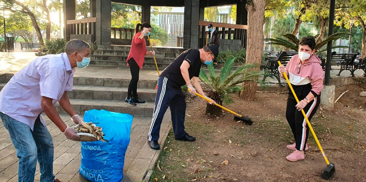 La jornada de limpieza y fumigación en todas las áreas de la plaza principal como manera de preservar el esplendor y combatir la pandemia del Coronavirus.