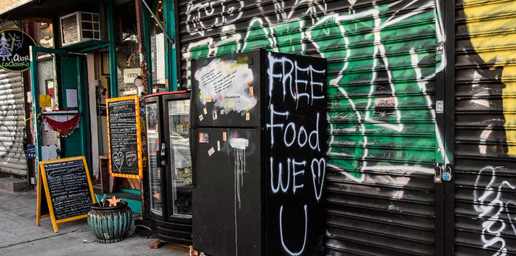 En la ciudad de Nueva York cerca de 2 millones de personas sufren de inseguridad alimentaria, refrigeradores como este se han convertido en una solución de la comunidad para la comunidad.