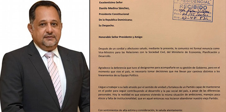 Según indica la carta de renuncia agradeció la deferencia del presidente Danilo Medina al designarle, pero que el momento que vive el país tomó la decisión de ir “por caminos distintos a los lineamientos de su Equipo Político”.