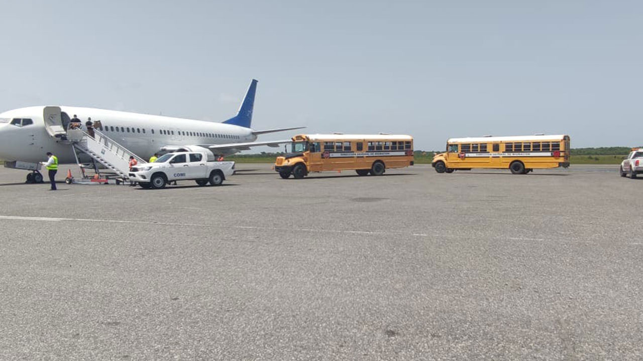 A su llegada al aeropuerto las autoridades de Migración y Salud Pública procedieron a examinar cuidadosamente uno por uno a los expresidarios antes de subirlos a los autobuses que los llevaría a la sede central de la Dirección General de Migración.