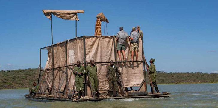 Para asegurarse de que las jirafas pudieran tolerar el viaje, el equipo trató de familiarizar a los animales con la vista de la barcaza durante un período de varios meses. Cuando llegó el momento de escoltar a una Asiwa sedada, le cubrieron los ojos con una capucha y la llevaron a la barcaza con cuerdas guía.