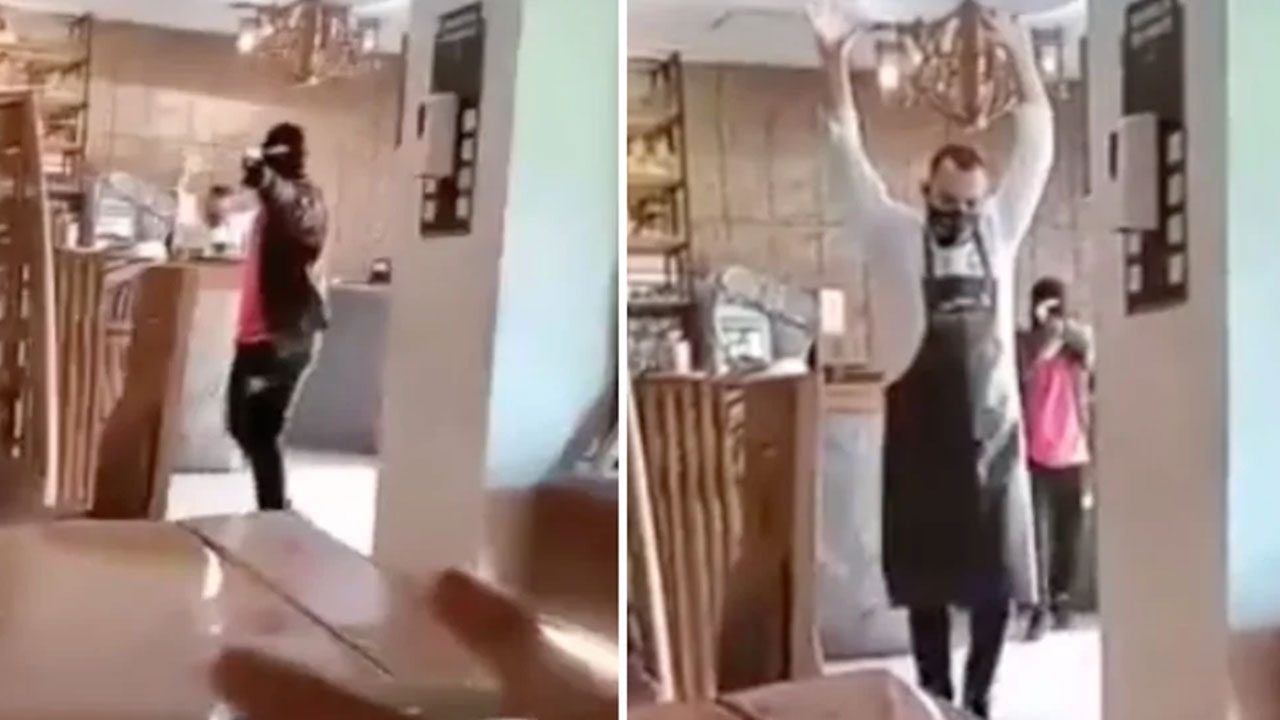 La filmación muestra el momento en el cual un supuesto ladrón, vistiendo un pasamontañas, ingresa al establecimiento con un arma de fuego y amenaza a los presentes. Las personas levantan los brazos y se tienden en el piso, mientras el “delincuente” ingresa y sale del restaurante en repetidas ocasiones.