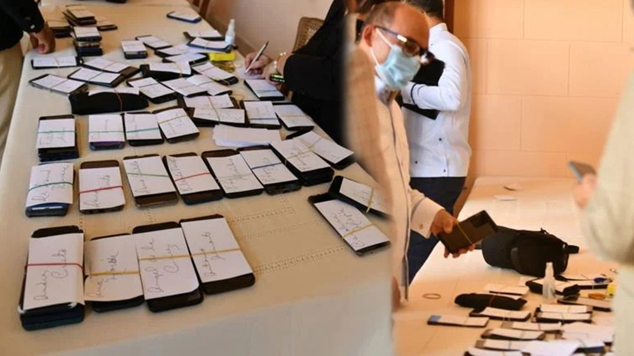 Cada uno de los celulares, a veces hasta más de dos dispositivos por persona, están colocados en filas y con un papel encima de ellos con el nombre del propietario, el cual es envuelto por una gomita elástica para evitar que se extravíen o se entregue el incorrecto.