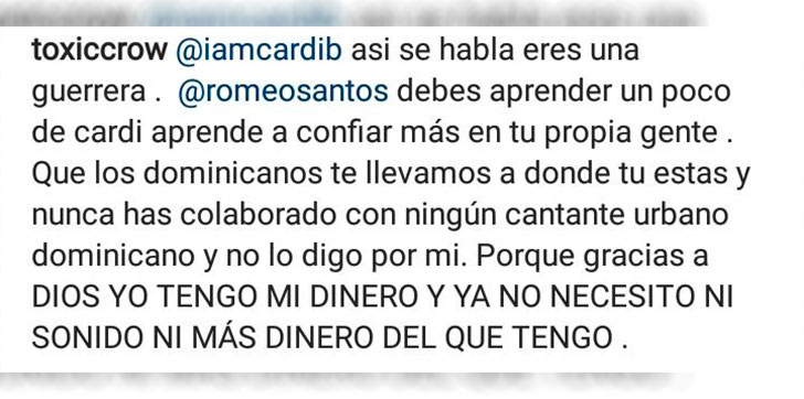 Sin embargo, en sus escritos también atacan al bachatero por olvidarse de los dominicanos que según lo dicho por Toxic Crow, lo han llevado donde esta hoy día y “nunca ha colaborado con ningún cantante urbano” por lo que le recomienda aprender de Cardi y confiar un poquito más en su gente.