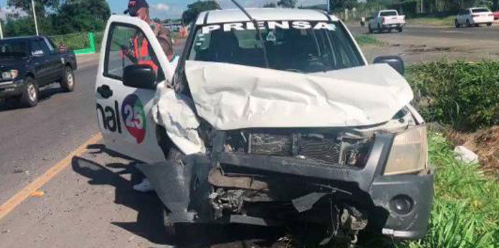 El vehículo del equipo de prensa quedó destrozado en la parte delantera y la puerta del pasajero.
