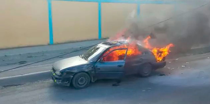 En la imagen se observa cómo arde el carro Toyota color gris.