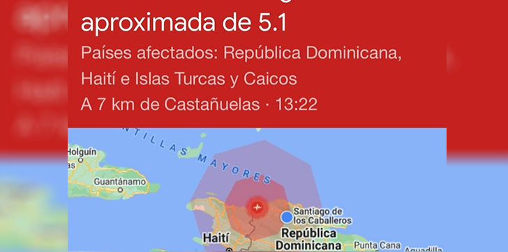 El terremoto ocurrió a las 13.22 hora local (17.22 GMT) y su epicentro fue localizado a 7 kilómetros del municipio de Castañuelas, en la provincia de Montecristi, en el noroeste dominicano, de acuerdo con datos preliminares del Servicio Geológico de Estados Unidos y de las autoridades locales.