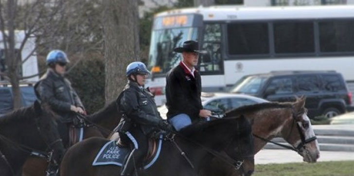 La mañana después de su juramentación, el ex congresista de Montana y antiguo SEAL se sumó a miembros de la Policía de Parques en el complejo de monumentos National Mall. De ahí cabalgó por el centro de Washington hasta el edificio del Departamento del Interior. Nueve policías de parques le acompañaron.