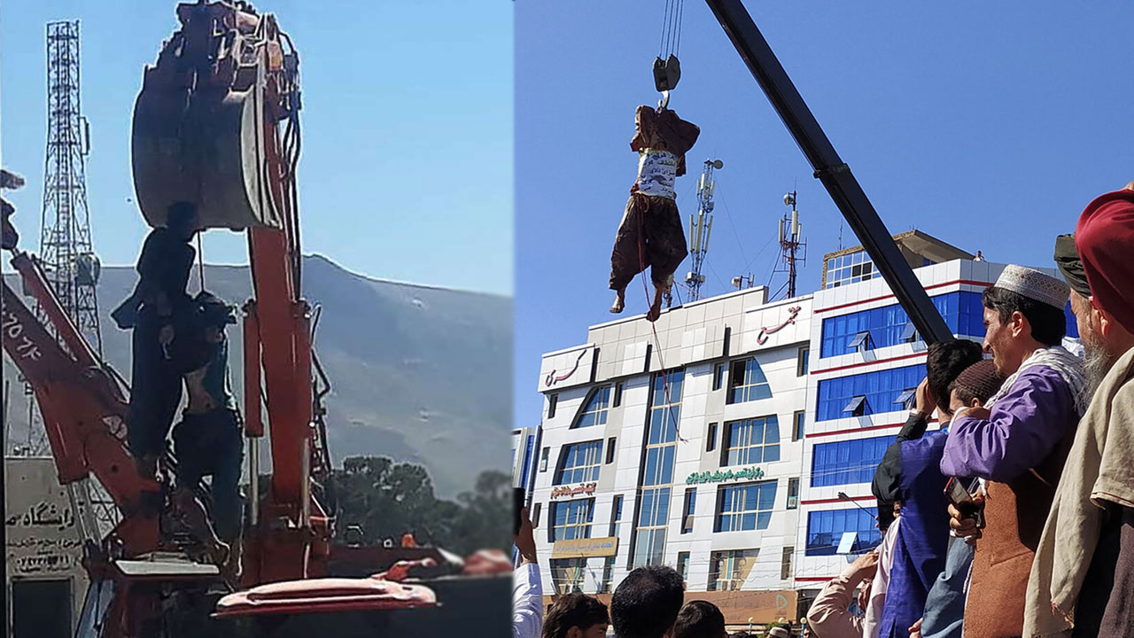 Talibanes en Afganistán cuelgan cuerpos de supuestos criminales desde grúas en vía pública