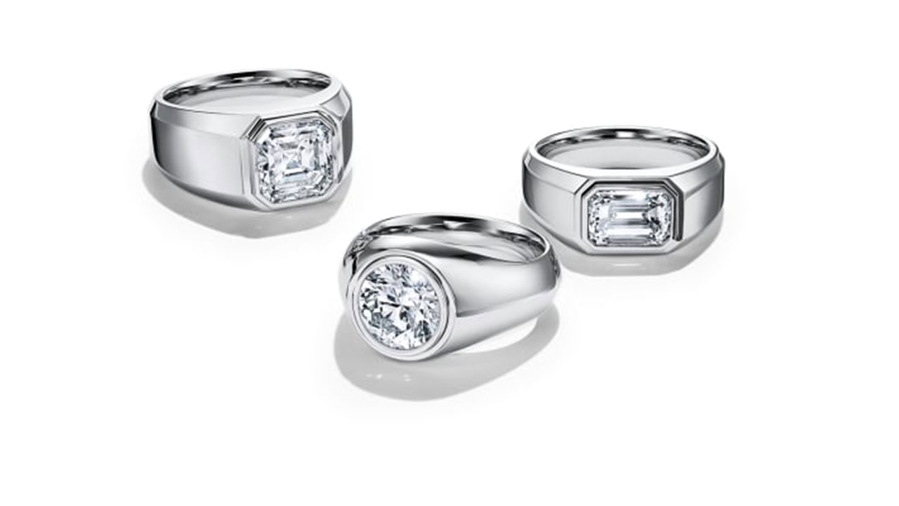 El diseño se inspira en los clásicos signets y viene en un engaste de titanio o de platino. Los anillos tienen bordes biselados angulares y un brillante diamante central de hasta cinco quilates.