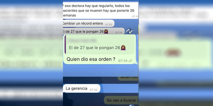 El programa tuvo acceso a una conversación del grupo de WhatsApp del departamento del 5 de enero de este año, en el que los residentes expresan como la nueva gerente de perinatología, Dagne Sánchez, instruye a bajar la edad gestacional de los recién nacidos fallecidos.