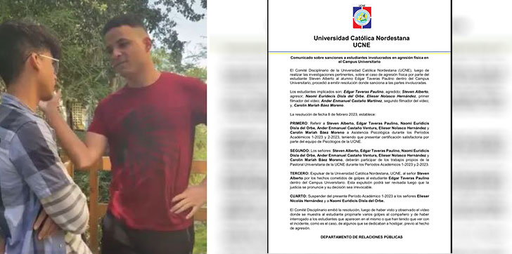 El Comité Disciplinario de la Universidad Católica Nordestana (UCNE), luego derealizar las investigaciones pertinentes, sobre el caso de agresión física por parte del estudiante Steven Alberto al alumno Edgar Taveras Paulino dentro del Campus Universitario, procedió a emitir resolución donde sanciona a las partes involucradas.