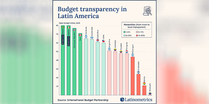 El estudio, presentado en el gráfico de Latinometrics, muestra que la República Dominicana alcanzó una de las puntuaciones más altas de la región, situándose en el percentil de mayor transparencia (0-25%). Perú, Honduras y Guatemala le siguen en el ranking regional.