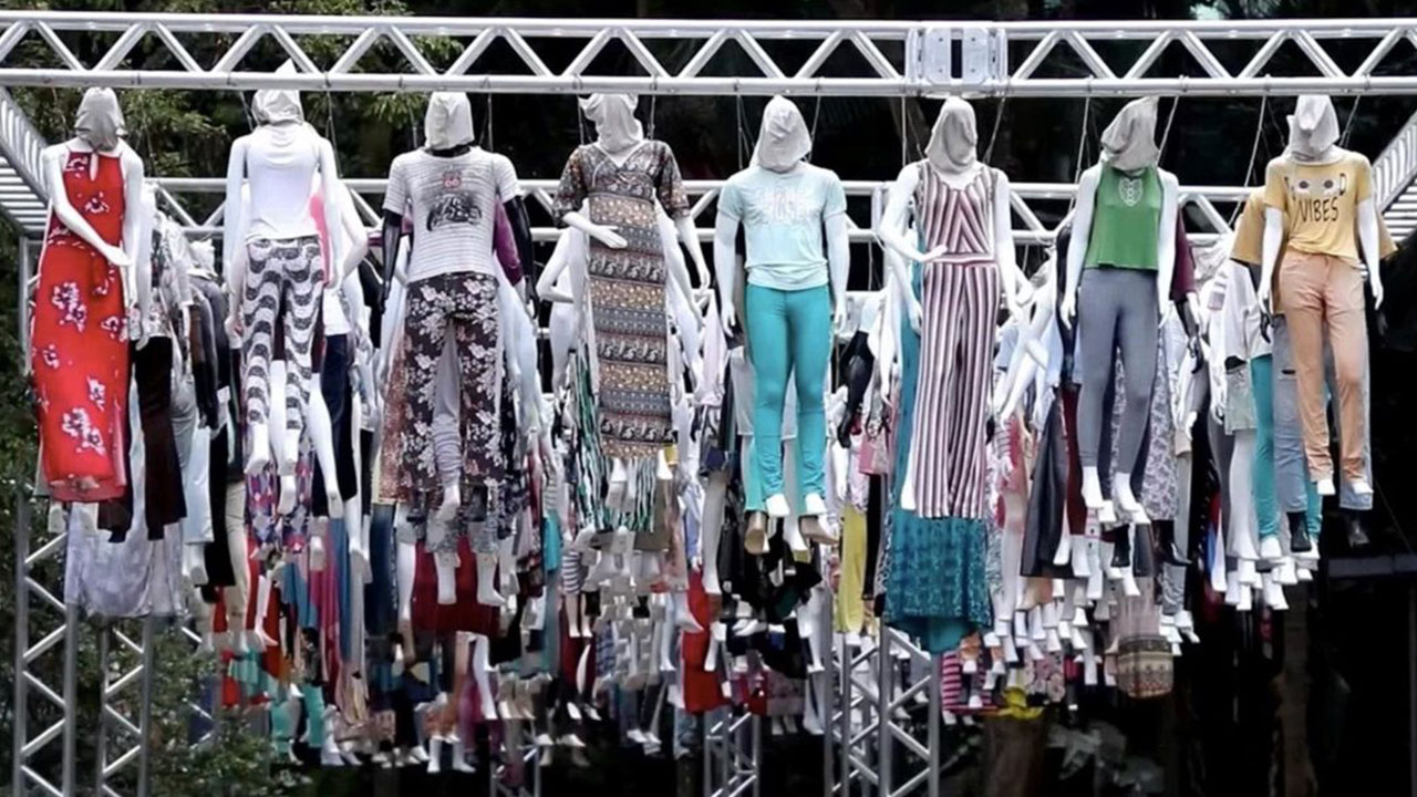 Los maniquíes, de distintos tamaños y vestidos con diversas vestimentas, están suspendidos con cables de acero a seis metros del suelo en el jardín de la “Casa das Rosas”.