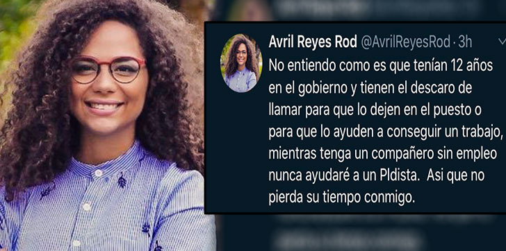 «No entiendo como es que tenían 12 años en el gobierno y tienen el descaro de llamar para que lo dejen en el puesto o para que lo ayuden a conseguir un trabajo, mientras tenga un compañero sin empleo nunca ayudaré a un Pldista. Asi que no pierda su tiempo conmigo», dijo la servidora pública en su cuenta de Twitter.