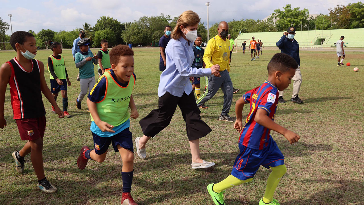 Vicepresidenta juega fútbol con niños en San Juan y promete remozamiento de estadio