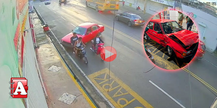 En las imágenes se puede observar como el conductor del carro marca Toyota modelo Corolla año 84-85 de color rojo con placa A 003535, pierde el control e impacta a tres personas, incluyendo una fémina.